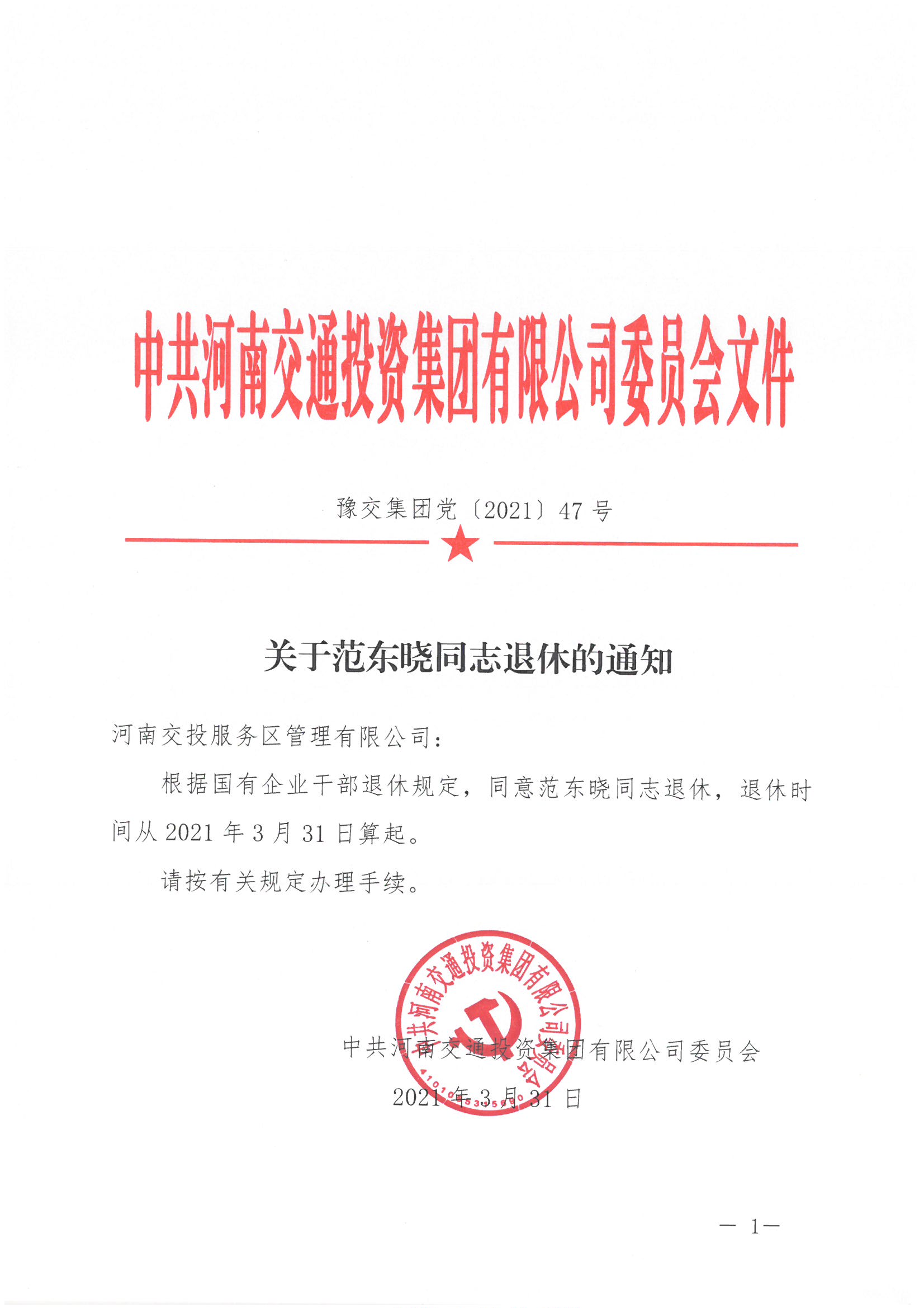 關于范東曉同志退休的通知(豫交集團黨【2021】47號)