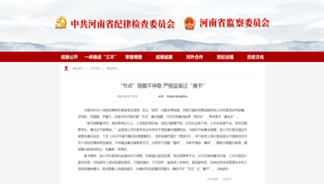 2月7日,省紀委監委網站工作動態基層風采專欄以題為《節點”提醒不停歇 嚴格監督過“廉節”》對服務區公司紀委開展節前提醒和節日期間監督工作進行報道。