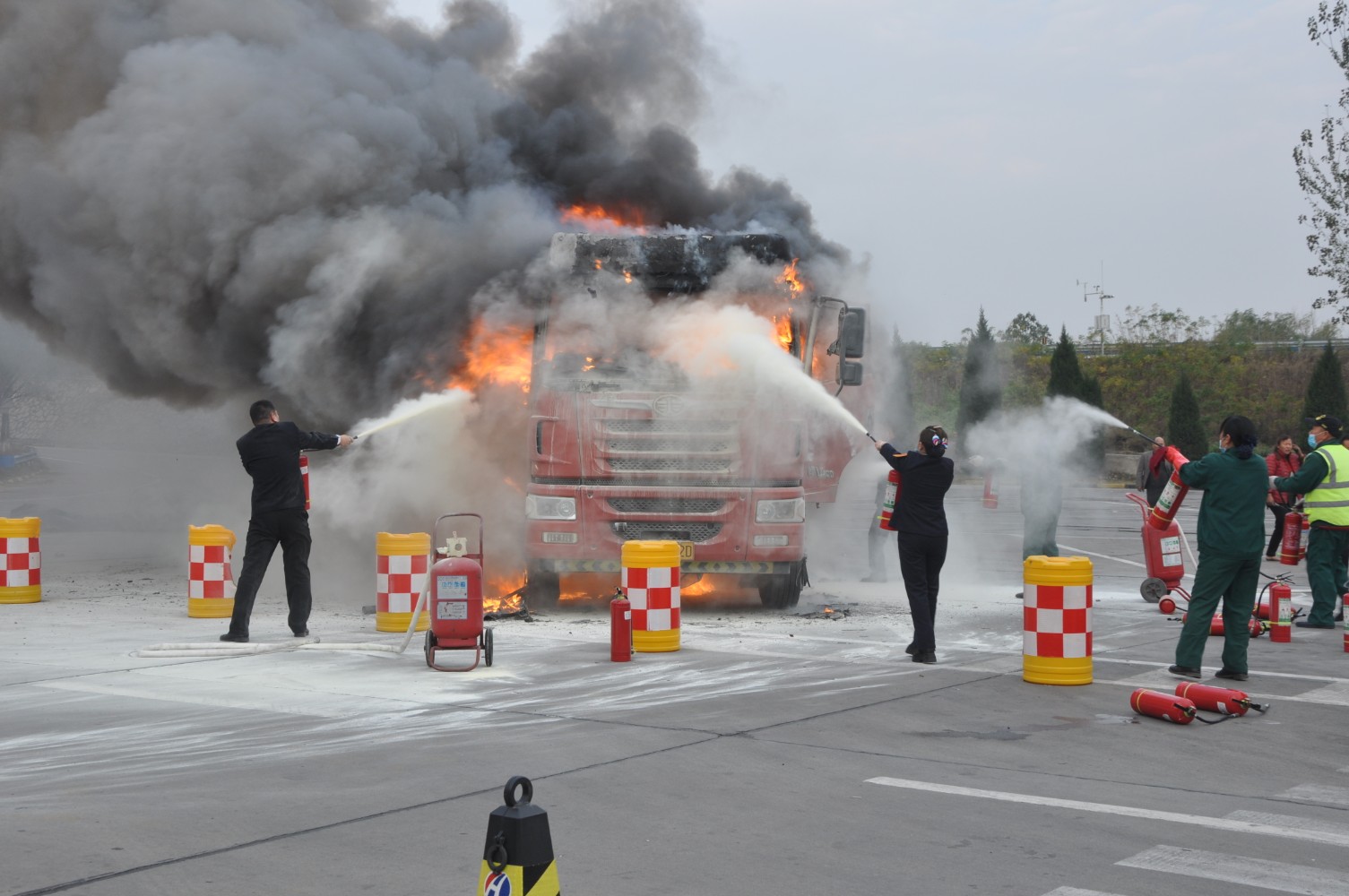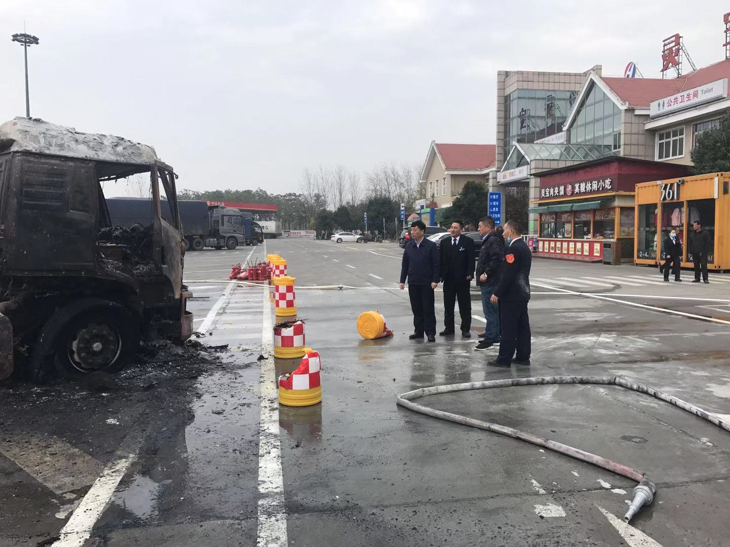 情況緊急,服務(wù)區(qū)、加油站第一時間啟動車輛自燃應(yīng)急預(yù)案:一方面用錐形標(biāo)對現(xiàn)場進行隔離,有序疏散圍觀人員以及停放的車輛,劃出安全區(qū);一方面組織員工集中干粉滅火器進行撲救,同時安排開啟消防栓。服務(wù)區(qū)經(jīng)理張鯤和副經(jīng)理南江波奮勇當(dāng)先,帶領(lǐng)十余名員工奮戰(zhàn)在搶險第一線,六十多個干粉滅火器用完,消防栓接連消防水帶繼續(xù)進行滅火。9:37分,火勢全部撲滅。