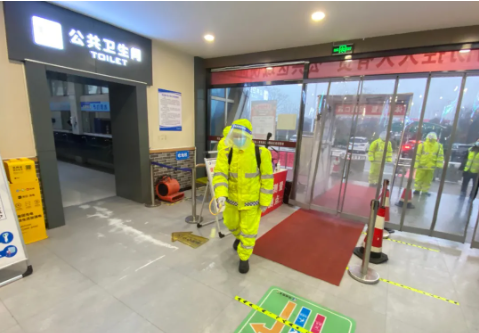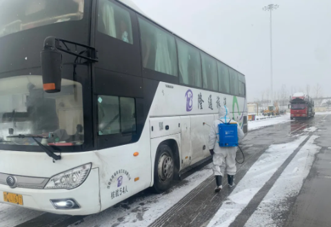1月24日上午,一輛滿載的大巴車停留在黃帝宮服務區,工作人員對車輛相關信息進行登記,同時對車輛周邊及車門處進行消殺。為減少人員大面積