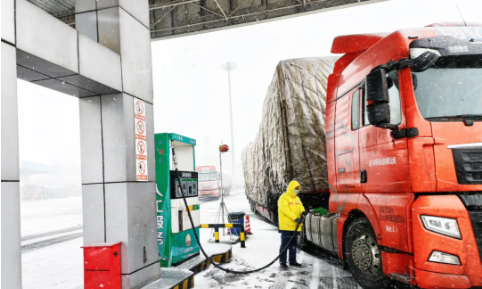 1月23日,三門峽加油站冒雨雪為貨運車輛提供加油服務 邢佛曉 攝
