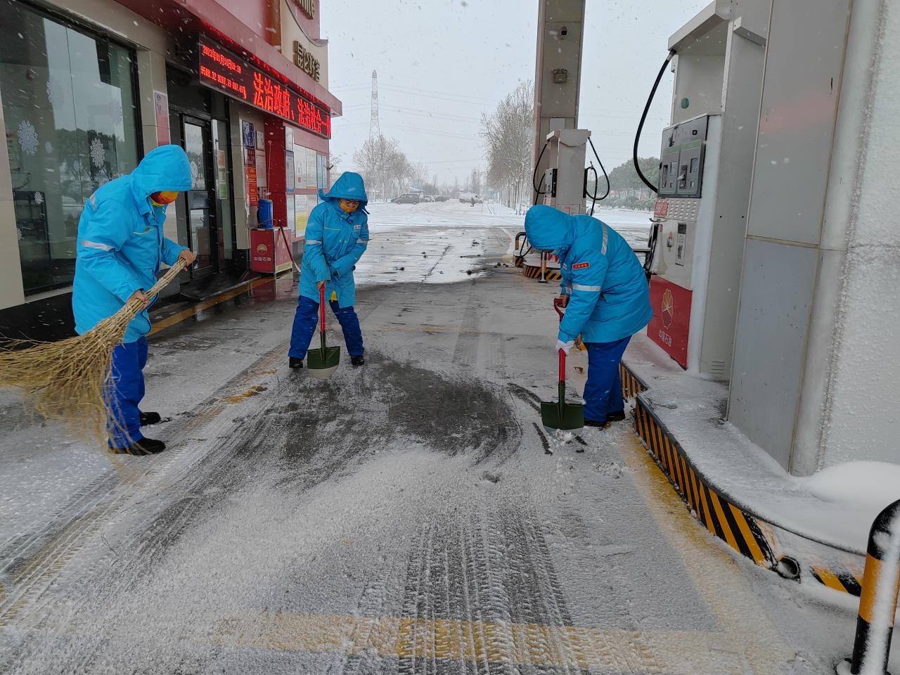 三是浴“雪”奮戰(zhàn)、全力保通。接到氣象預(yù)警提示后,及時(shí)在上下道口、廣場(chǎng)及加油通道等區(qū)域拋撒融雪劑,避免道路積雪結(jié)冰,保障車輛和人員進(jìn)出安全;各服務(wù)區(qū)、加油站黨員職工沖鋒在前,帶領(lǐng)廣大職工使用鐵鍬、推雪板、掃帚等除雪工具,對(duì)上下道口、加油車道、配電房、油罐區(qū)等區(qū)域積雪進(jìn)行全面清理,確保道路安全暢通,保障司乘行車安全;及時(shí)清除通道雨棚、充電樁車棚等屋頂積雪,防止因積雪造成棚頂坍塌等意外發(fā)生;在經(jīng)營(yíng)場(chǎng)所臺(tái)階、人行通道,鋪設(shè)防滑墊、草柵等防滑設(shè)施,進(jìn)一步提高地面防滑性能,降低人員摔傷風(fēng)險(xiǎn);提前做好道路封閉、擁堵等應(yīng)急情況下的儲(chǔ)油、油量控制銷售、加油車輛引導(dǎo)等工作。