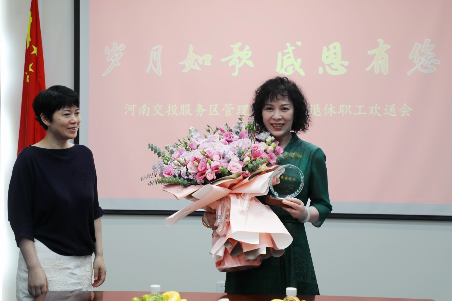 歡送會上,高納副總經理為退休職工送上了鮮花和紀念品,表達了真摯的祝愿,希望退休職工繼續保持高昂樂觀的生活熱情,退休不褪色,一如既往關心支持公司工作,積極建言獻策。