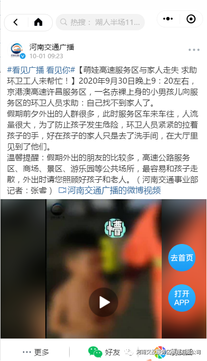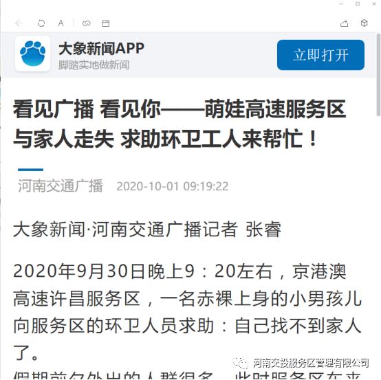 10月01日,大象網(wǎng)、微博視頻·河南交通廣播以題為《看見(jiàn)廣播 看見(jiàn)你——萌娃高速服務(wù)區(qū)與家人走失 求助環(huán)衛(wèi)工人來(lái)幫忙!》對(duì)所屬許昌服務(wù)區(qū)好人好事進(jìn)行了報(bào)道。