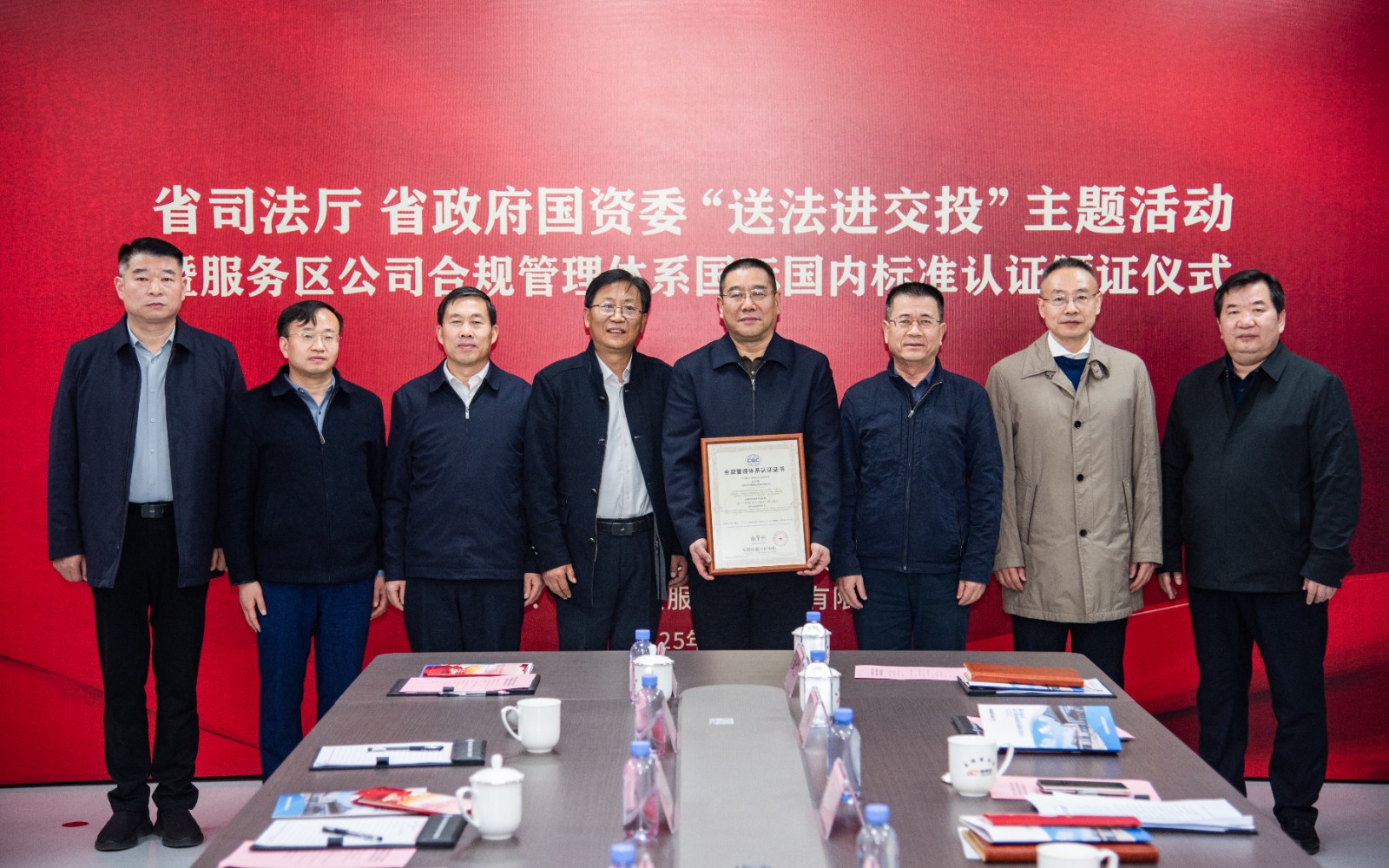 12月4日是第十二個國家憲法日,省司法廳、省政府國資委在集團所屬連霍高速開封服務(wù)區(qū)聯(lián)合開展“送法進交投”憲法宣傳周主題活動暨服務(wù)區(qū)公司合規(guī)管理體系國際國內(nèi)標準認證頒證儀式。省司法廳二級巡視員武寶山,普法與依法治理處處長楊永峰;省政府國資委黨委委員、副主任劉孟連,研究室處長李會展、副處長李衛(wèi)敏;中國檢驗認證集團華中區(qū)域黨委副書記、常務(wù)副總經(jīng)理胡小鐘,河南公司黨委委員、副總經(jīng)理任源;交投集團黨委委員、副總經(jīng)理馬沉重,法律事務(wù)部經(jīng)理劉??;服務(wù)區(qū)公司黨委書記、董事長谷源,總經(jīng)理、黨委副書記、副董事長邱建成,黨委委員、副總經(jīng)理張帥、閻瑞杰等出席會議。