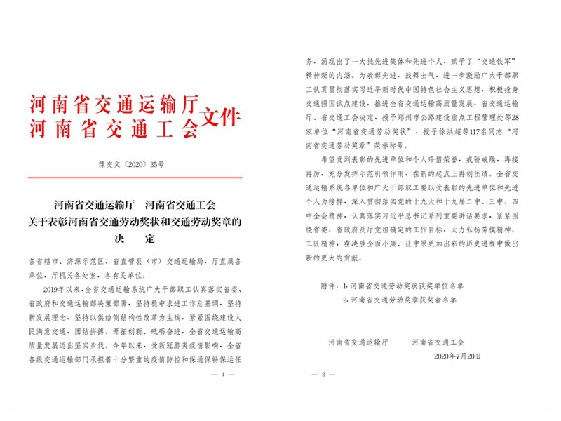 喜訊!公司榮獲“河南省交通勞動(dòng)獎(jiǎng)狀”