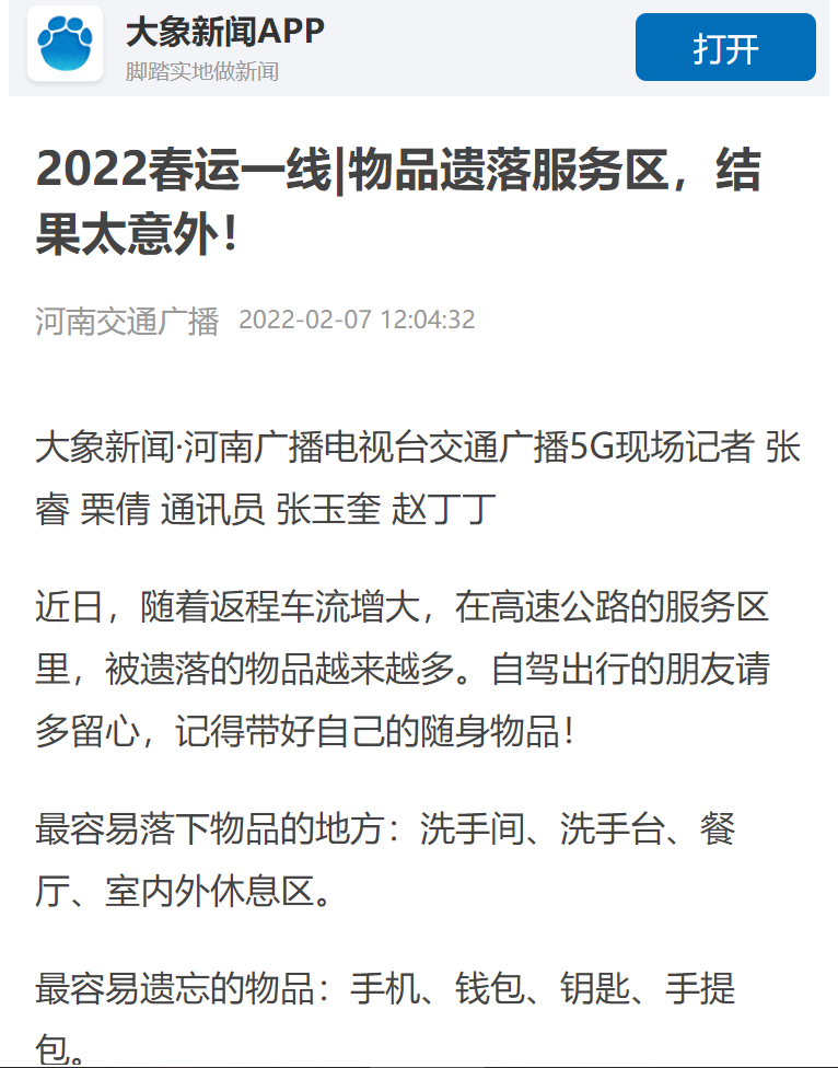 來源: 本站 發(fā)布時間: 2022-02-072月7日,“河南交通廣播”、今日頭條、“河南交通廣播”新浪微博官方號等媒體以“2022春運一線|物品遺落服務(wù)區(qū),結(jié)果太意外!”為題,對公司所屬服務(wù)區(qū)春節(jié)期間溫馨服務(wù)進行宣傳報道。點擊原文:https://share.hntv.tv/news/0/1490536932762804226https://www.toutiao.com/i70…
