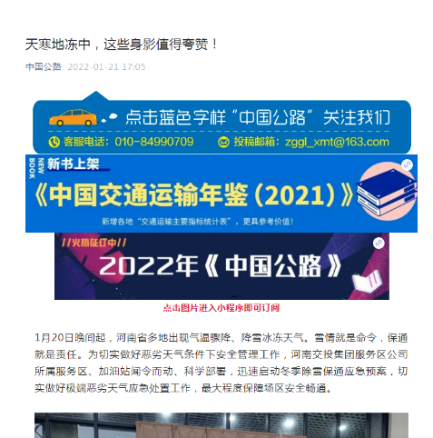 來(lái)源: 本站 發(fā)布時(shí)間: 2022-01-212022年1月21日,中國(guó)公路網(wǎng)以題為《以雪為令,除雪保暢 為公眾出行保駕護(hù)航》對(duì)服務(wù)區(qū)公司所屬服務(wù)區(qū)、加油站除雪保通工作情況進(jìn)行報(bào)道。網(wǎng)址:https://www.chinahighway.com/article/65392738.html截圖: