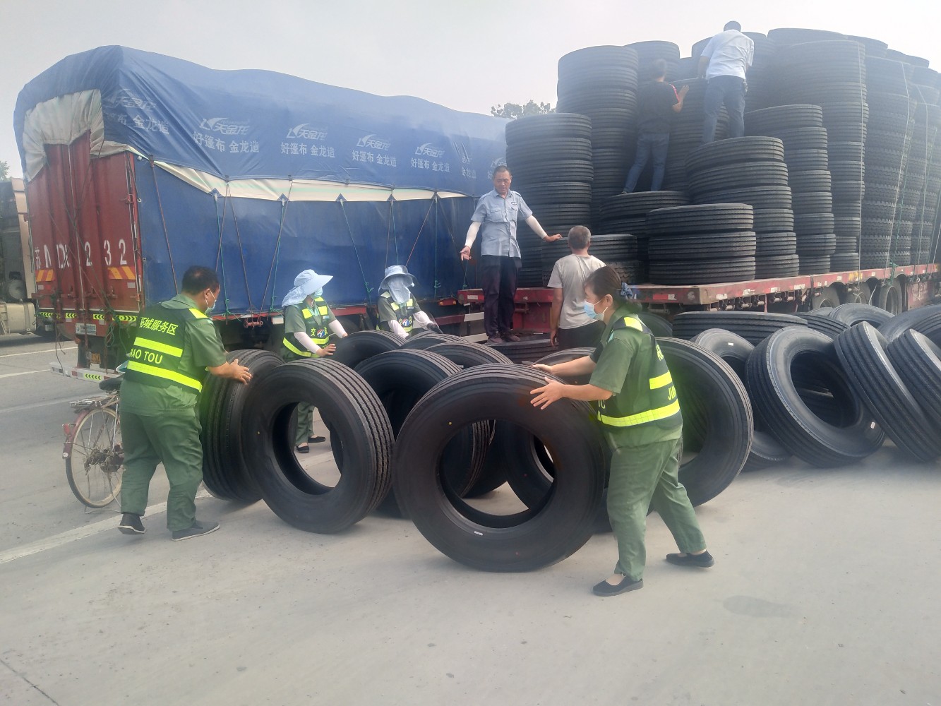 6月15日,柘城服務(wù)區(qū)值班員巡查時發(fā)現(xiàn)一輛大貨車由于貨物捆綁不夠牢固,車輛所載輪胎散落一地,駕駛員正一籌莫展。