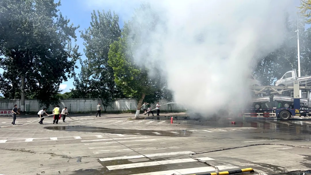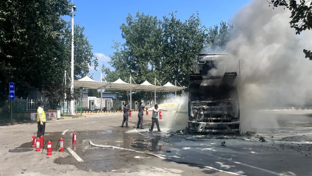 值班經理第一時間確認貨車司乘安全后,立即啟動了應急預案,撥打了119,告知周邊司乘將車輛撤離至安全區域,組織人員跑步趕至現場進行滅火。救援人員通過使用干粉滅火器、消防水帶對火焰進行噴灑,以減緩火勢的蔓延,經過30分鐘奮力撲救,火勢終于得到控制。15:10許,119消防車輛趕至現場,服務區積極配合119消防救援人員直至完全撲滅火焰。